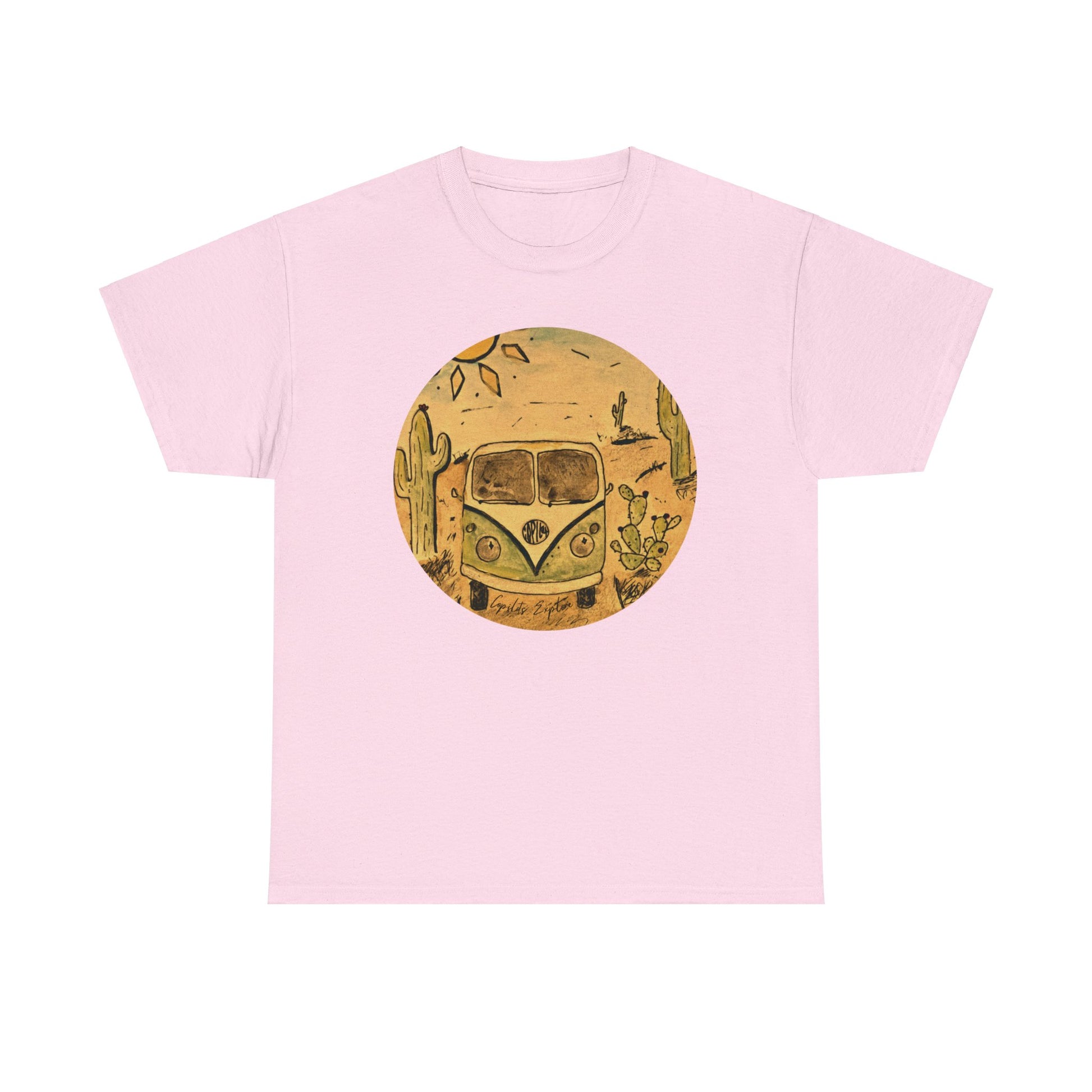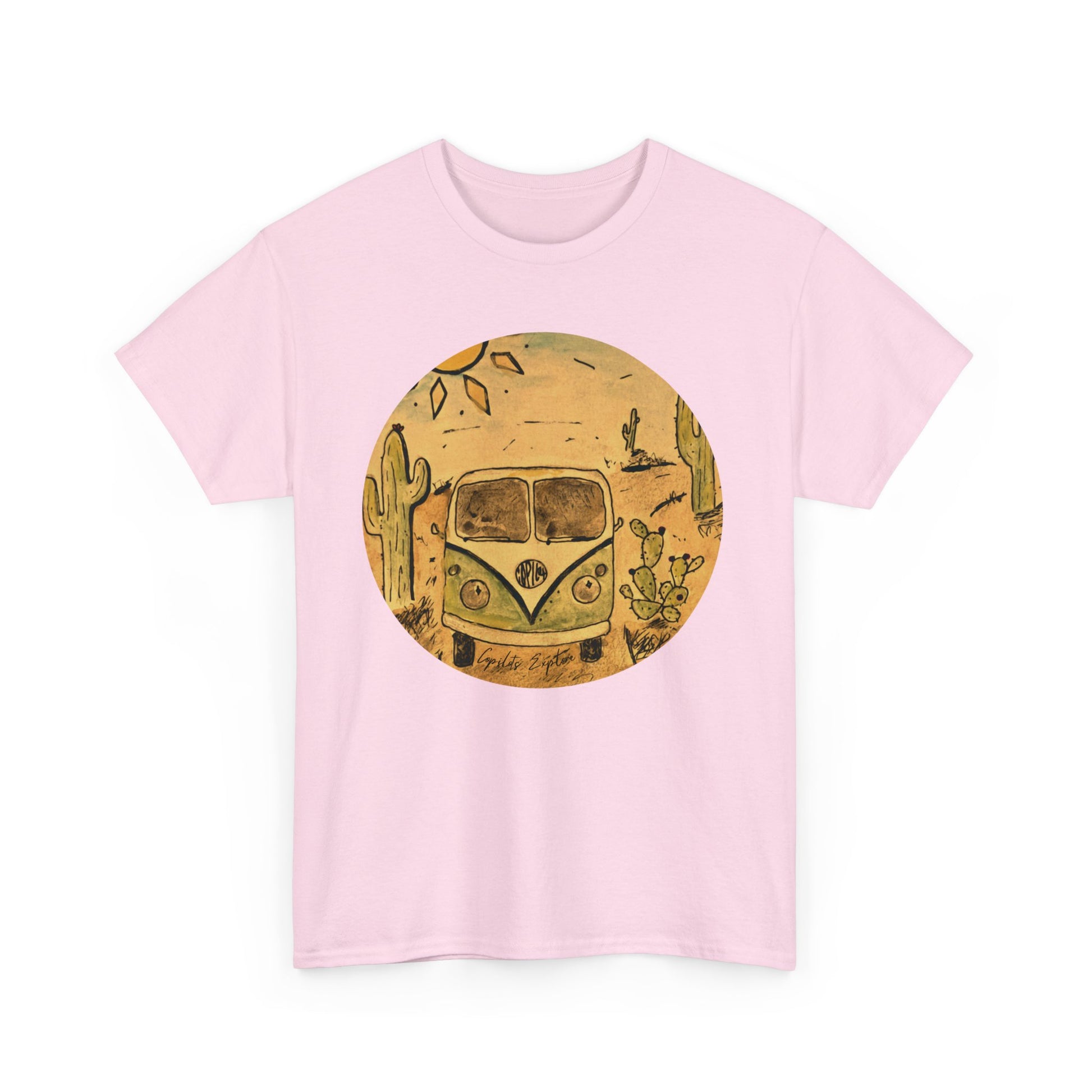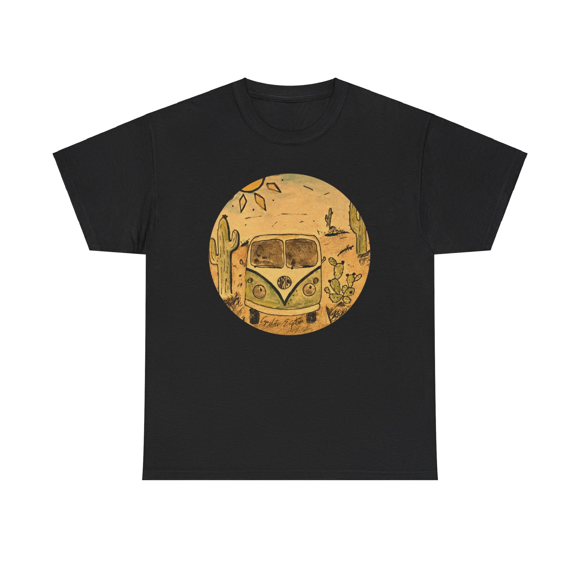 Additional features include a double-stitched neckline and sleeves for added durability, a tagless design for extra comfort, and eco-friendly printing methods that ensure vibrant, long-lasting colors. Available in various sizes, this t-shirt is a must-have addition to any Volkswagen lover's wardrobe. Embrace the spirit of adventure and nostalgia with this exclusive VW Bus desert t-shirt.