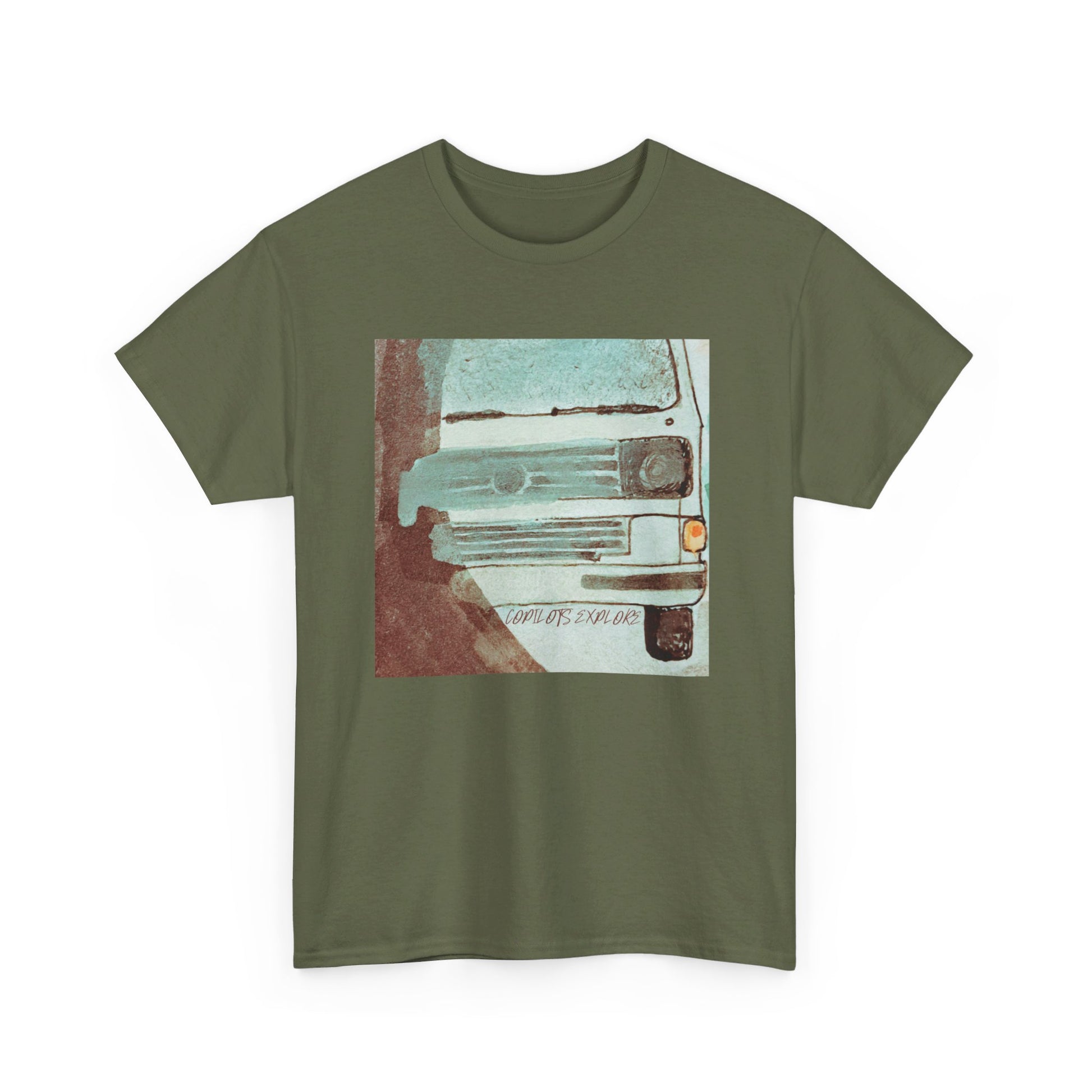 Step into the world of retro adventure with our 100% Cotton Volkswagen Vanagon Shirt. This edgy, natural-colored shirt features a grunge watercolor style painting of the iconic Volkswagen Vanagon, perfect for those who love vintage vibes and unique designs.